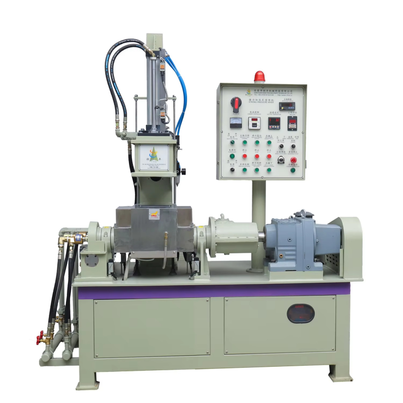 The two rotors in the mixing chamber rotate relative to each other under a certain speed ratio, clamping the material from the feeding port and bringing it into the roller gap to be squeezed and sheared by the rotors. After passing through the roller gap, it hits the sharp edge of the mixing chamber "W" and is divided into two parts, respectively along the gap between the front and rear chamber walls and the rotors and then returns to the top of the rotor. In the closed mixing chamber, the material is strongly sheared and mixed under certain pressure and temperature conditions, so that the formula materials are fully dispersed and plasticized, so that the formula can play the best effect.
